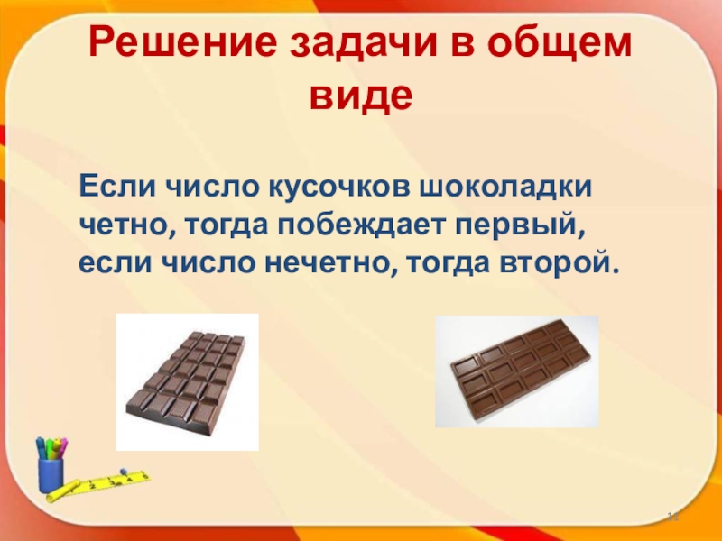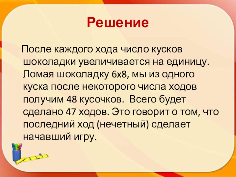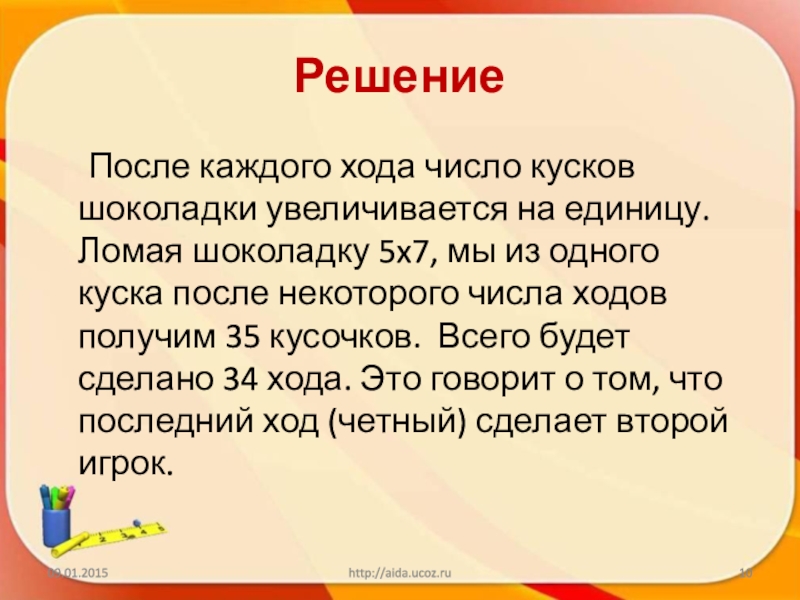 единицу. Ломая шоколадку 5x7, мы из одного куска после некоторого числа ходов получим 35 кусочков. Всего будет сделано 34 хода. Это говорит о том, что последний ход (четный) сделает второй игрок.