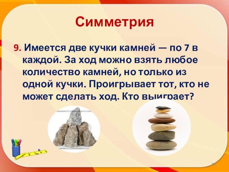 9. Имеется две кучки камней — по 7 в каждой. За