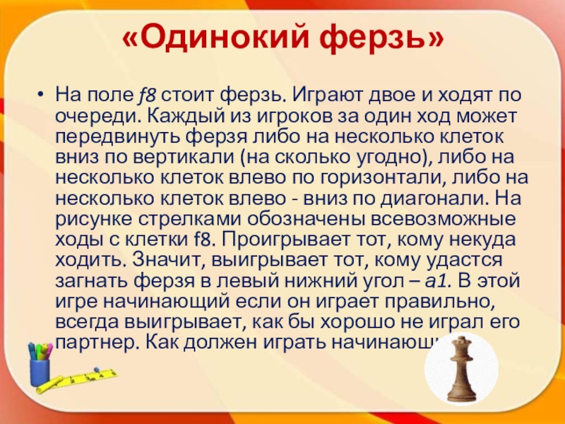 очереди. Каждый из игроков за один ход может передвинуть ферзя либо на несколько клеток вниз по вертикали (на сколько угодно), либо на несколько клеток влево по горизонтали, либо на несколько клеток влево - вниз по диагонали. На рисунке стрелками обозначены всевозможные ходы с клетки f8. Проигрывает тот, кому некуда ходить. Значит, выигрывает тот, кому удастся загнать ферзя в левый нижний угол – а1. В этой игре начинающий если он играет правильно, всегда выигрывает, как бы хорошо не играл его партнер. Как должен играть начинающий?