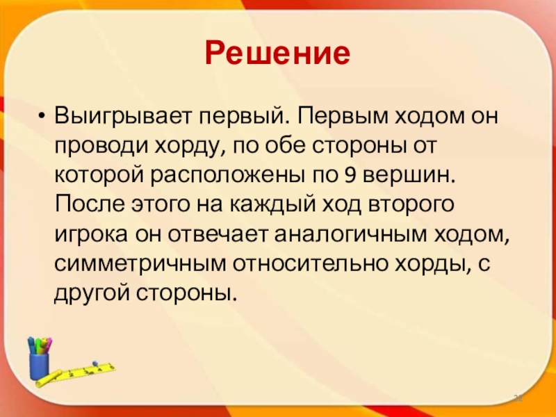 которой расположены по 9 вершин. После этого на каждый ход второго игрока он отвечает аналогичным ходом, симметричным относительно хорды, с другой стороны.