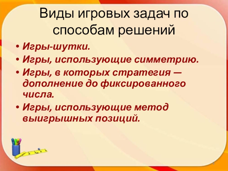 Слайд 5Виды игровых задач по способам решений
