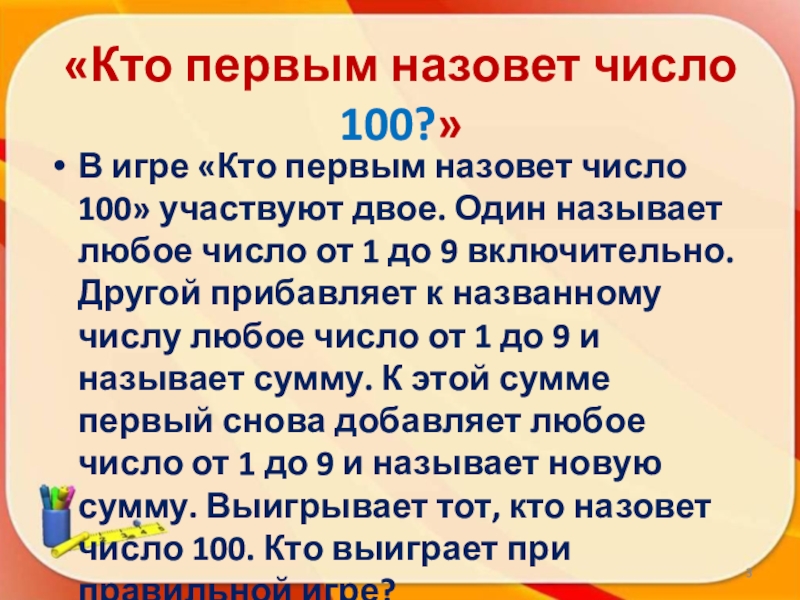 Слайд 3В игре «Кто первым назовет число 100» участвуют двое. Один называет