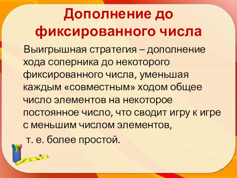 до некоторого фиксированного числа, уменьшая каждым «совместным» ходом общее число элементов на некоторое постоянное число, что сводит игру к игре с меньшим числом элементов,