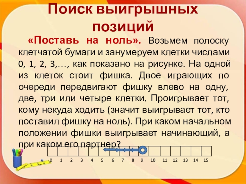 и занумеруем клетки числами 0, 1, 2, 3,…, как показано на рисунке. На одной из клеток стоит фишка. Двое играющих по очереди передвигают фишку влево на одну, две, три или четыре клетки. Проигрывает тот, кому некуда ходить (значит выигрывает тот, кто поставил фишку на ноль). При каком начальном положении фишки выигрывает начинающий, а при каком его партнер?