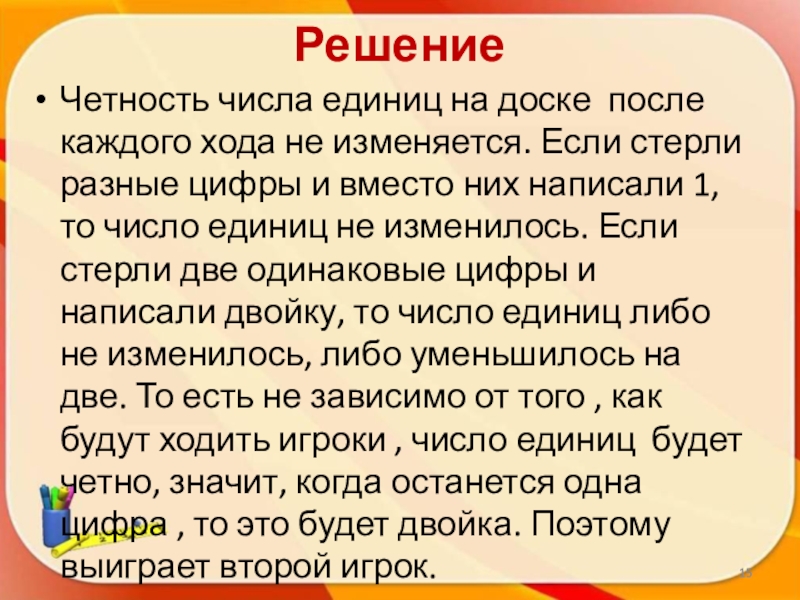 того, как играют соперники. Поэтому для решения такой игры-задачи не нужно указывать выигрышную стратегию. Достаточно лишь доказать, что выигрывает тот или иной игрок (независимо от того, как будет играть).