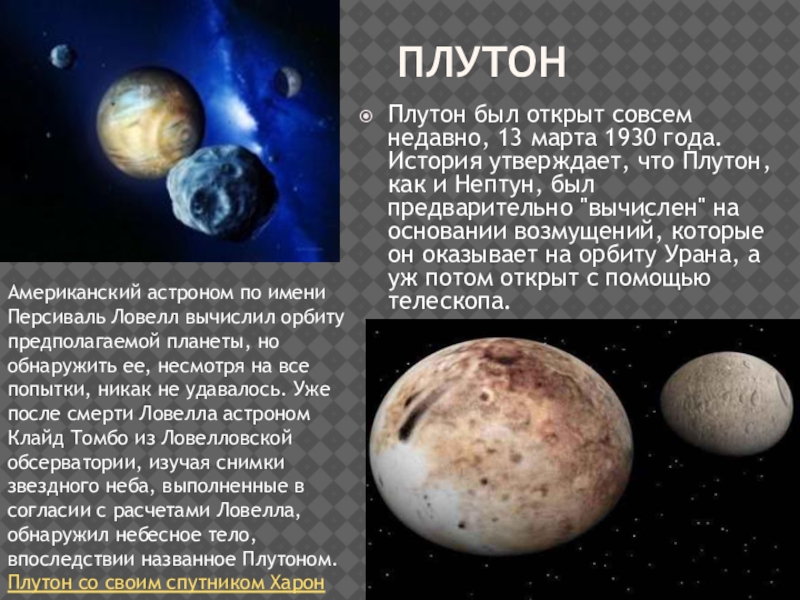 Американский астроном по имени Персиваль Ловелл вычислил орбиту предполагаемой планеты, но обнаружить ее, несмотря на все попытки, никак не удавалось. Уже после смерти Ловелла астроном Клайд Томбо из Ловелловской обсерватории, изучая снимки звездного неба, выполненные в согласии с расчетами Ловелла, обнаружил небесное тело, впоследствии названное Плутоном. Плутон со своим спутником Харон