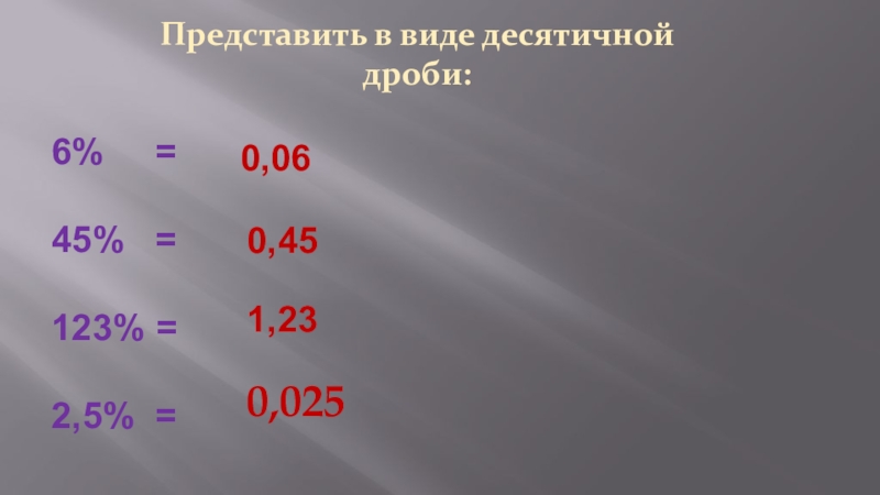 Чтобы перевести проценты в десятичную дробь, надо разделить число процентов на 100