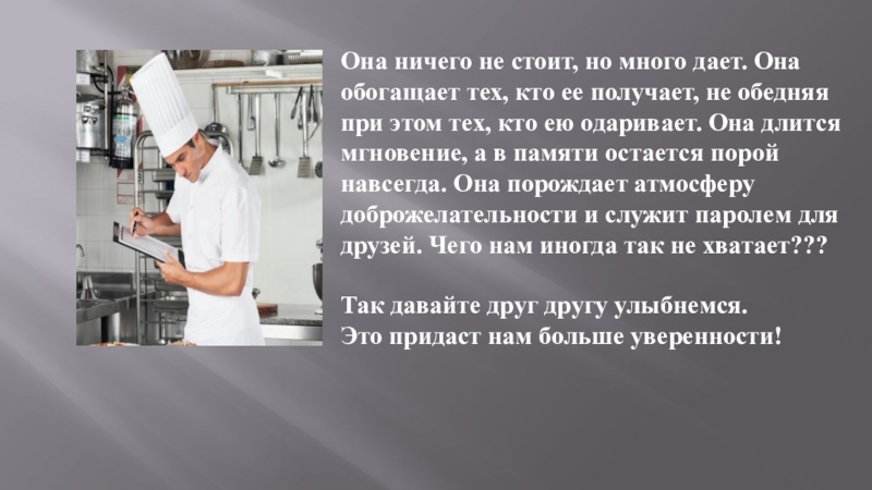 Так давайте друг другу улыбнемся. Это придаст нам больше уверенности!