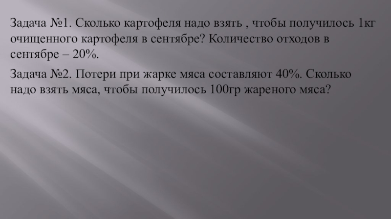 Задача №2. Потери при жарке мяса составляют 40%. Сколько надо взять мяса, чтобы получилось 100гр жареного мяса?