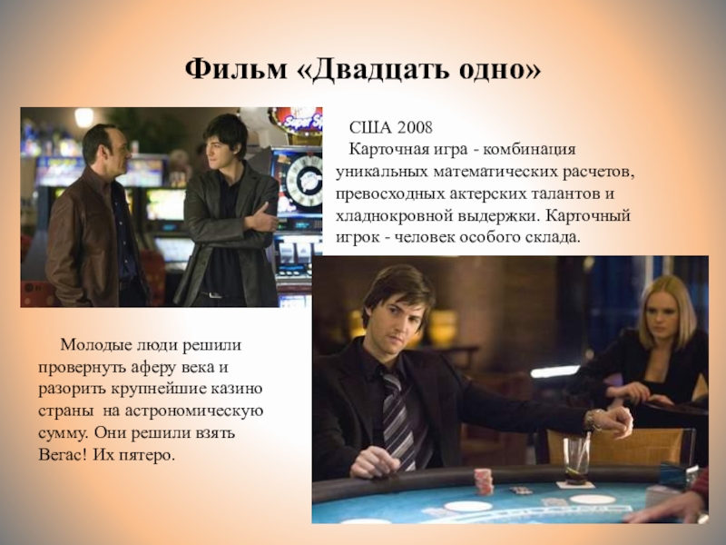 Молодые люди решили провернуть аферу века и разорить крупнейшие казино страны на астрономическую сумму. Они решили взять Вегас! Их пятеро.