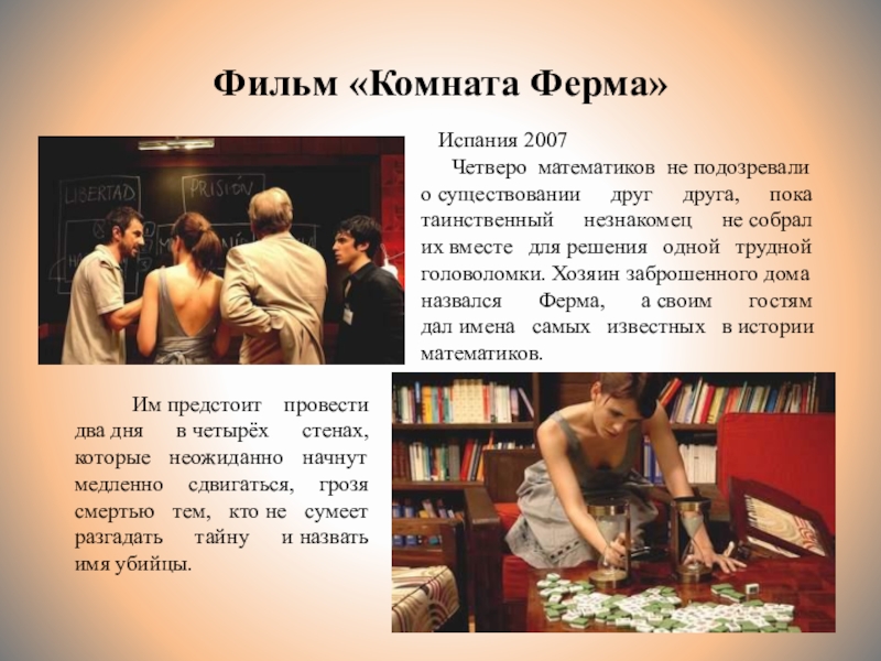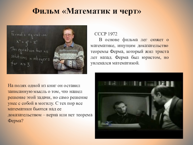 В основе фильма лег сюжет о математике, ищущим доказательство теоремы Ферма, который жил триста лет назад. Ферма был юристом, но увлекался математикой.