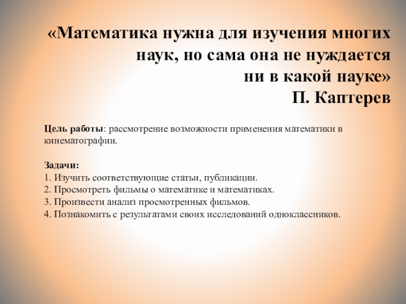 Цель работы: рассмотрение возможности применения математики в кинематографии.