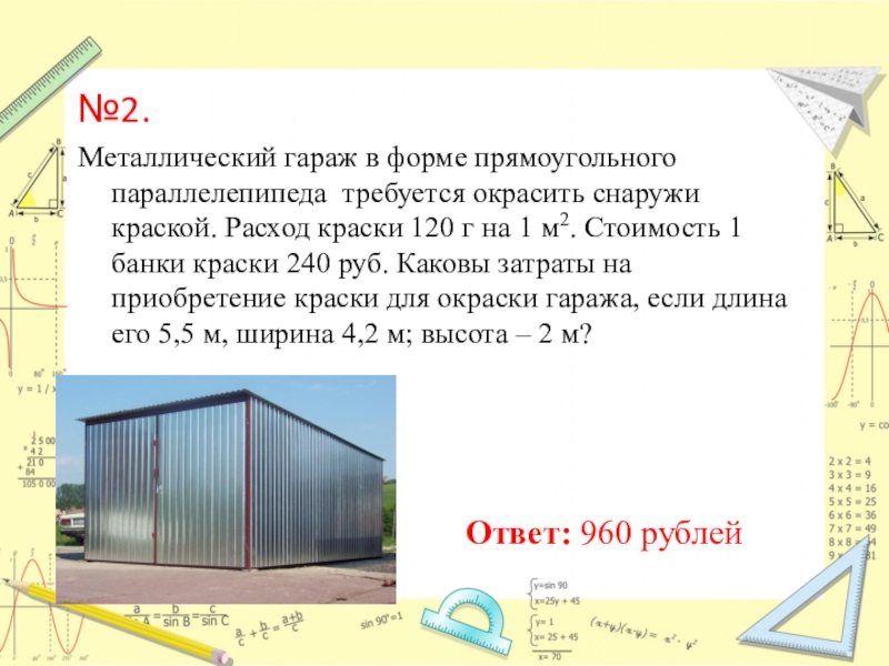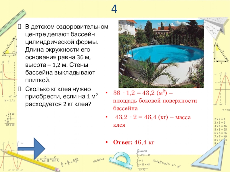 36 · 1,2 = 43,2 (м2) – площадь боковой поверхности бассейна