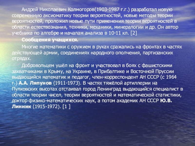Добровольцем ушёл на фронт и участвовал в боях с фашистскими захватчиками в Крыму, на Украине, в Прибалтике и Восточной Пруссии выдающийся математик и педагог, член-корреспондент АН СССР (с 1964 г.) А.А. Ляпунов (1911-1973). В частях тяжёлой артиллерии на Пулковских высотах отстаивал город Ленинград выдающийся специалист в области теории чисел, теории вероятностей и математической статистики, доктор физико-математических наук, а потом академик АН СССР Ю.В. Линник (1915-1972). [1 ]