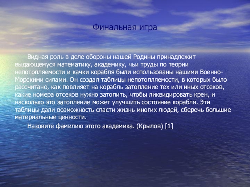 академику, чьи труды по теории непотопляемости и качки корабля были использованы нашими Военно-Морскими силами. Он создал таблицы непотопляемости, в которых было рассчитано, как повлияет на корабль затопление тех или иных отсеков, какие номера отсеков нужно затопить, чтобы ликвидировать крен, и насколько это затопление может улучшить состояние корабля. Эти таблицы дали возможность спасти жизнь многих людей, сберечь большие материальные ценности.