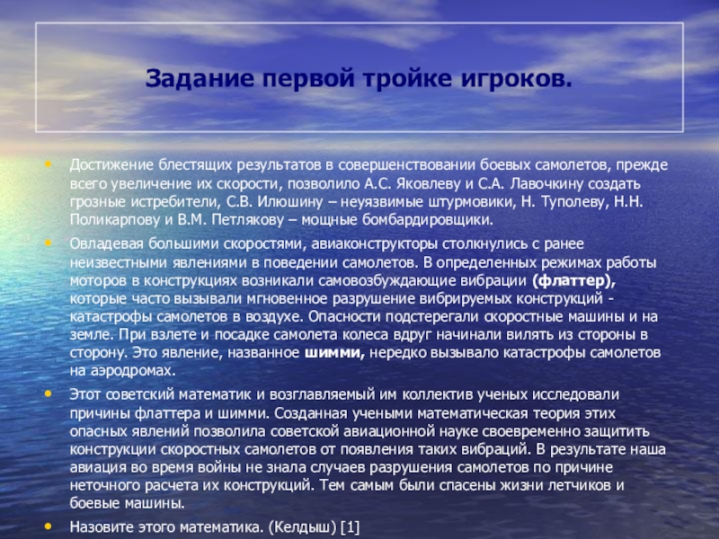 Этот советский математик и возглавляемый им коллектив ученых исследовали причины флаттера и шимми. Созданная учеными математическая теория этих опасных явлений позволила советской авиационной науке своевременно защитить конструкции скоростных самолетов от появления таких вибраций. В результате наша авиация во время войны не знала случаев разрушения самолетов по причине неточного расчета их конструкций. Тем самым были спасены жизни летчиков и боевые машины.
