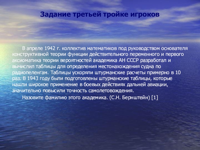 основателя конструктивной теории функции действительного переменного и первого аксиоматика теории вероятностей академика АН СССР разработал и вычислил таблицы для определения местонахождения судна по радиопеленгам. Таблицы ускоряли штурманские расчеты примерно в 10 раз. В 1943 году были подготовлены штурманские таблицы, которые нашли широкое применение в боевых действиях дальней авиации, значительно повысили точность самолетовождения.
