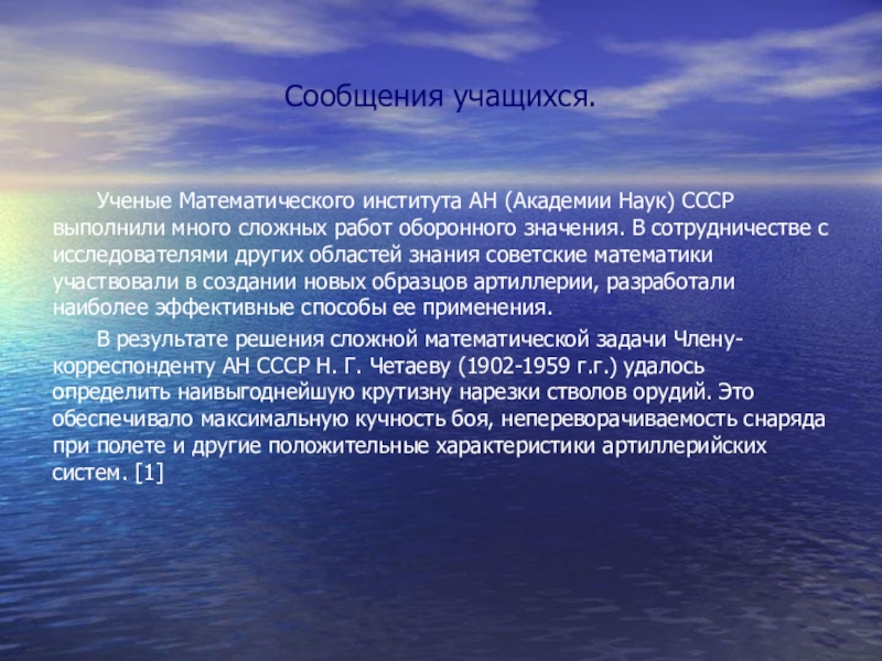 работ оборонного значения. В сотрудничестве с исследователями других областей знания советские математики участвовали в создании новых образцов артиллерии, разработали наиболее эффективные способы ее применения.