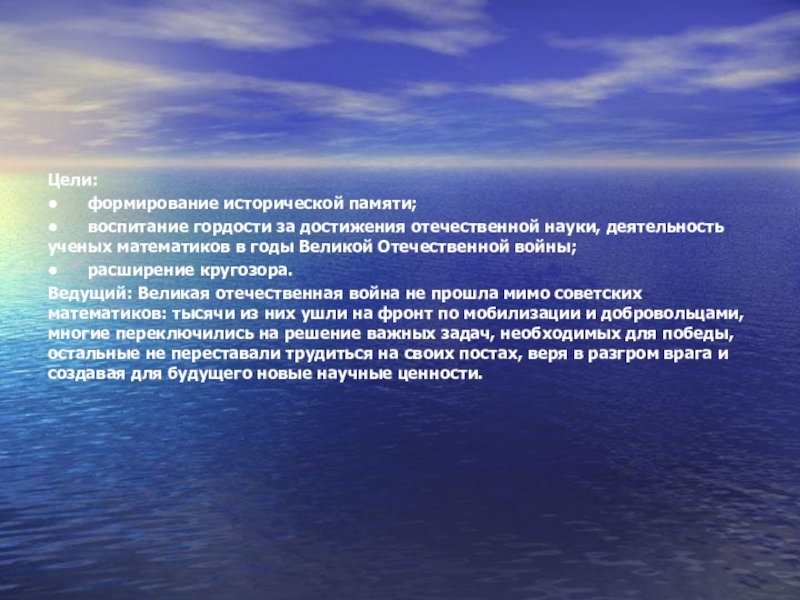 Ведущий: Великая отечественная война не прошла мимо советских математиков: тысячи из них ушли на фронт по мобилизации и добровольцами, многие переключились на решение важных задач, необходимых для победы, остальные не переставали трудиться на своих постах, веря в разгром врага и создавая для будущего новые научные ценности.