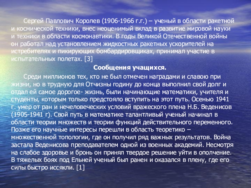 Среди миллионов тех, кто не был отмечен наградами и славою при жизни, но в трудную для Отчизны годину до конца выполнил свой долг и отдал ей самое дорогое- жизнь, были начинающие математики, учителя и студенты, которым только предстояло вступить на этот путь. Осенью 1941 г. умер от ран и нечеловеческих условий вражеского плена Н.Б. Веденисов (1905-1941 г). Свой путь в математике талантливый ученый начинал в области теории множеств и теории функций действительного переменного. Позже его научные интересы перешли в область теоретико – множественной топологии, где он получил ряд важных результатов. Война застала Веденисова преподавателем одной из военных академий. Несмотря на слабое здоровье и бронь он принял твердое решение уйти в ополчение. В тяжелых боях под Ельней ученый был ранен и оказался в плену, где его силы быстро иссякли. [1]