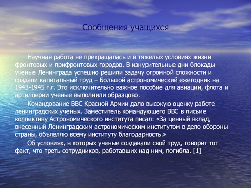 и прифронтовых городов. В изнурительные дни блокады ученые Ленинграда успешно решили задачу огромной сложности и создали капитальный труд – Большой астрономический ежегодник на 1943-1945 г.г. Это исключительно важное пособие для авиации, флота и артиллерии ученые выполнили образцово.