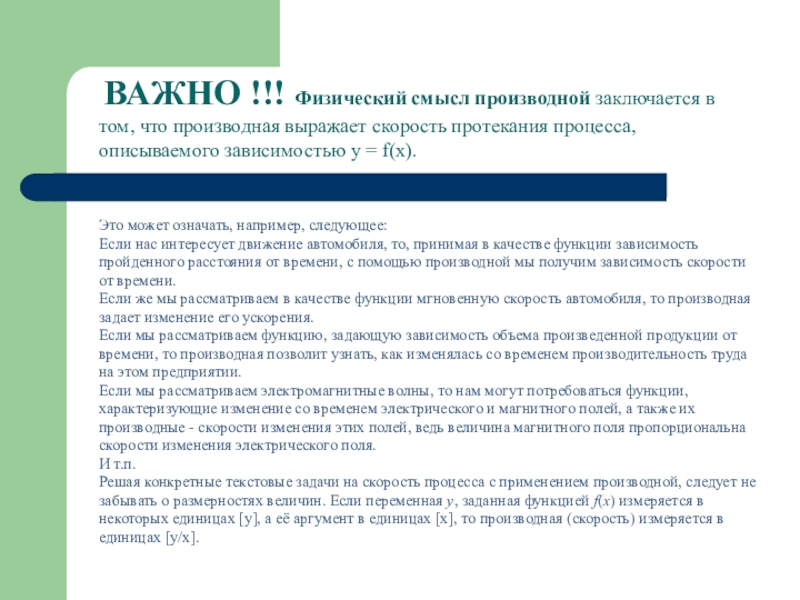 Решая конкретные текстовые задачи на скорость процесса с применением производной, следует не забывать о размерностях величин. Если переменная y, заданная функцией f(x) измеряется в некоторых единицах [y], а её аргумент в единицах [x], то производная (скорость) измеряется в единицах [y/x].