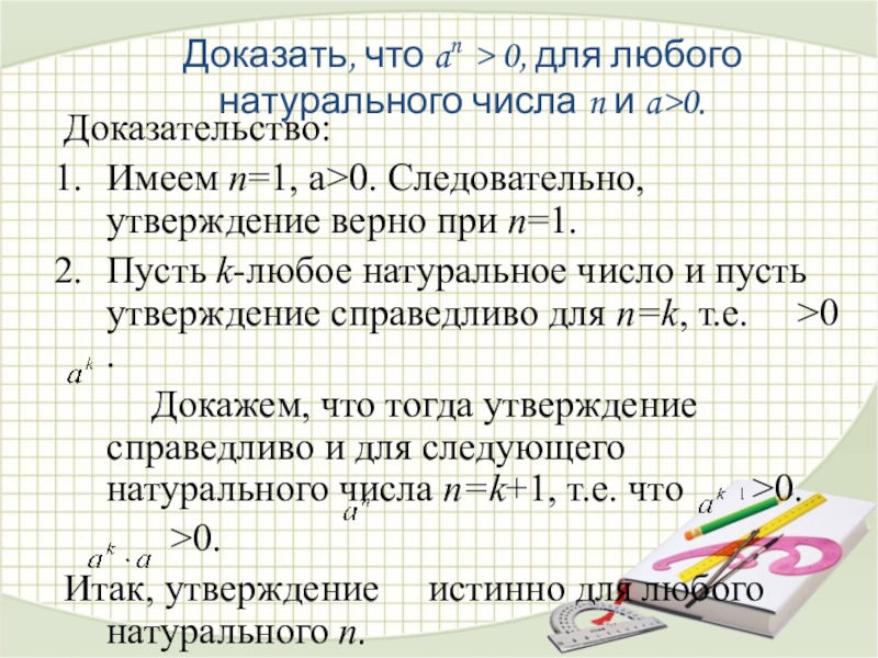 Докажем, что тогда утверждение справедливо и для следующего натурального числа n=k+1, т.е. что >0.