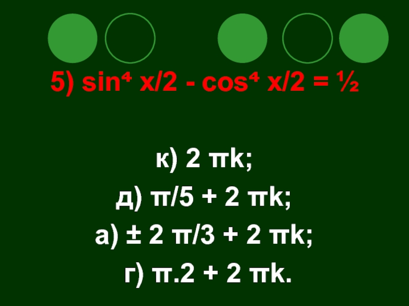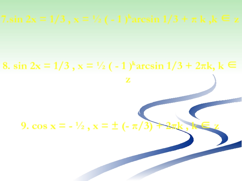 9. cos x = - ½ , x = ± (- π/3) + 2πk , k ∈ z