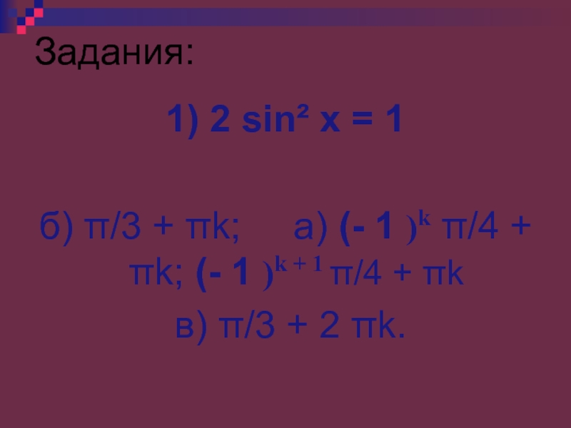 а) (- 1 )k π/4 + πk; (- 1 )k + 1 π/4 + πk