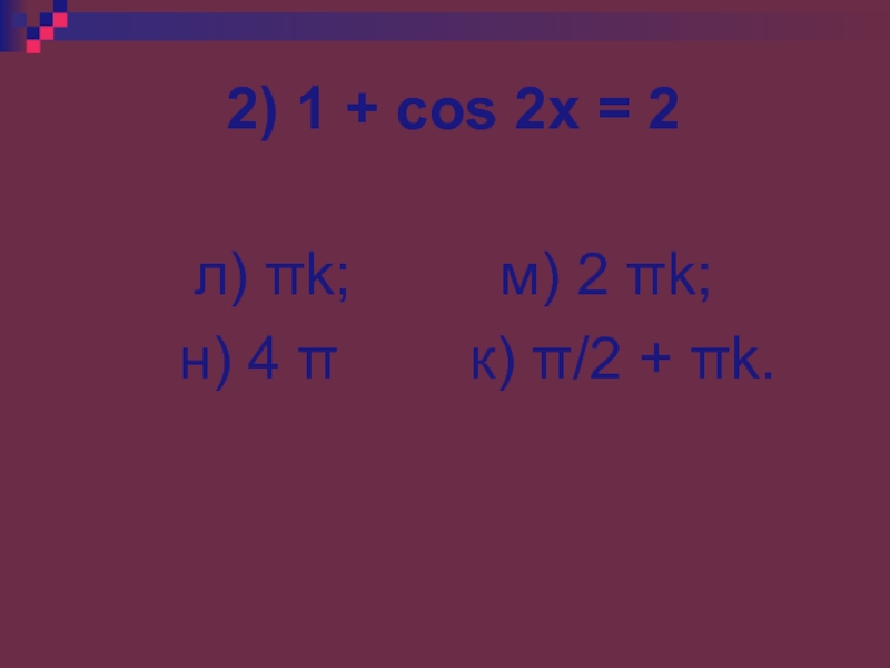 Слайд 472) 1 + cos 2x = 2