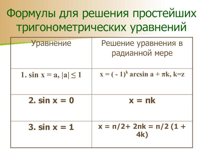 Слайд 10Формулы для решения простейших тригонометрических уравнений