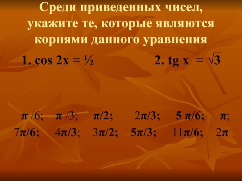 Слайд 25Среди приведенных чисел, укажите те, которые являются корнями данного уравнения