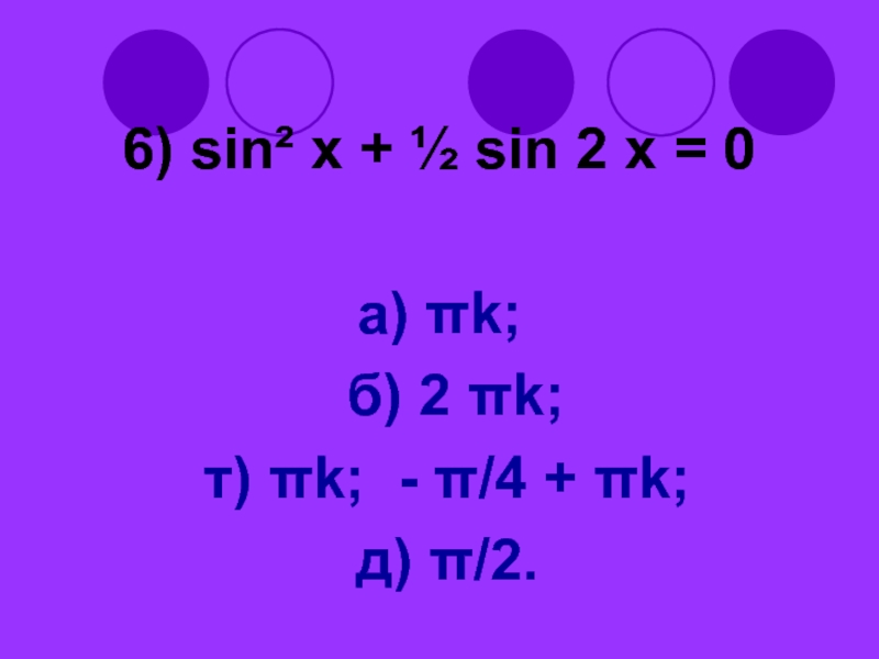 Слайд 516) sin² x + ½ sin 2 x = 0