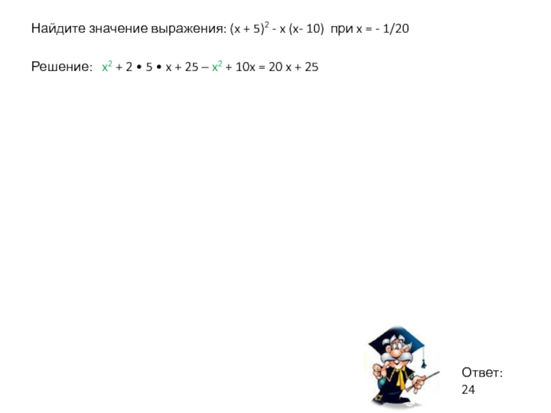 Решение: x2 + 2 • 5 • x + 25 – x2 + 10x = 20 x + 25
