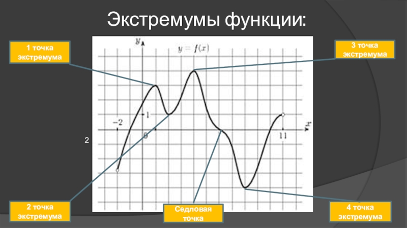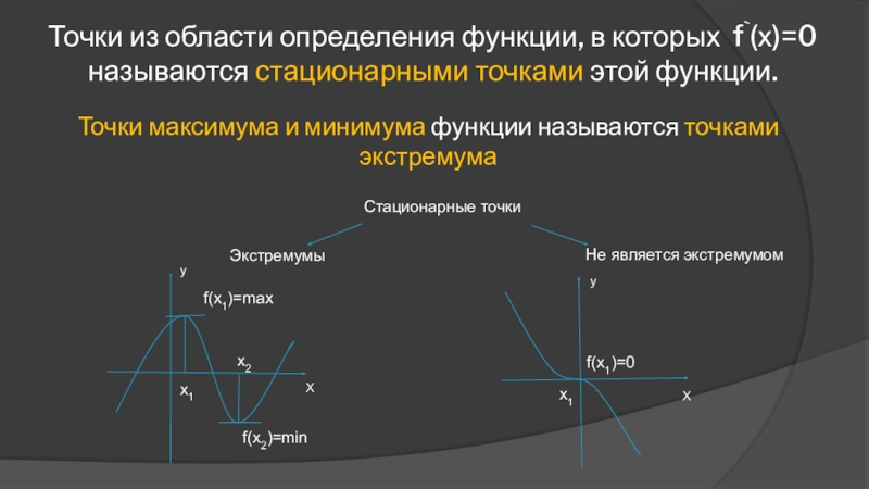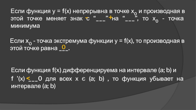 х0 Є (a; b) , и f '(х0) = 0. Тогда если при переходе через стационарную точку х0 функции f(х) ее производная меняет знак с “–” на “+”, то точка х0 – точка ____________ функции f(x)