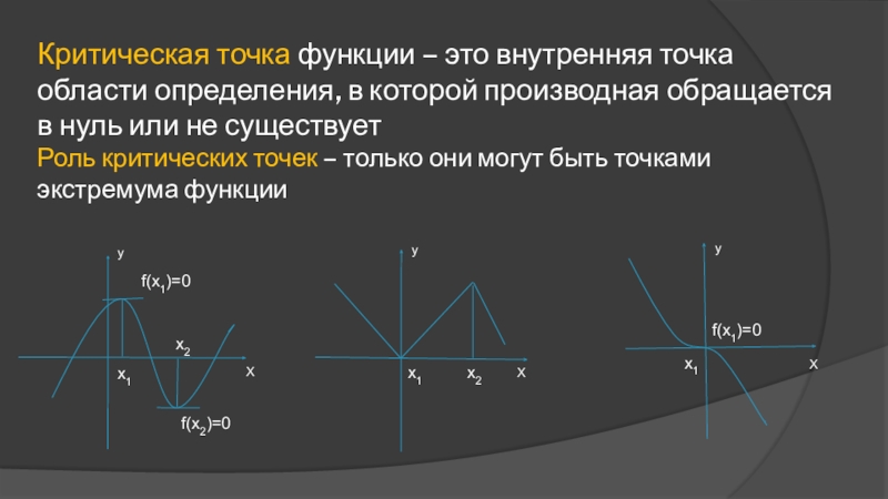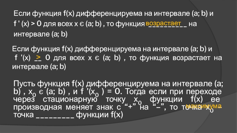 Пусть функция f(x) дифференцируема на интервале (a; b) , х0 Є (a; b) , и f '(х0 ) = 0. Тогда если при переходе через стационарную точку х0 функции f(х) ее производная меняет знак с “+” на “–”, то точка х0 – точка _________ функции f(x)