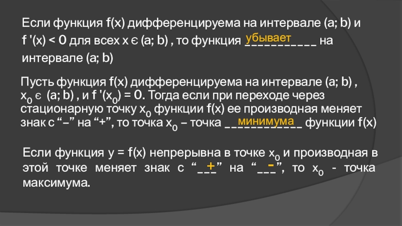 f '(х) ___0 для всех х Є (a; b) , то функция убывает на интервале (a; b)