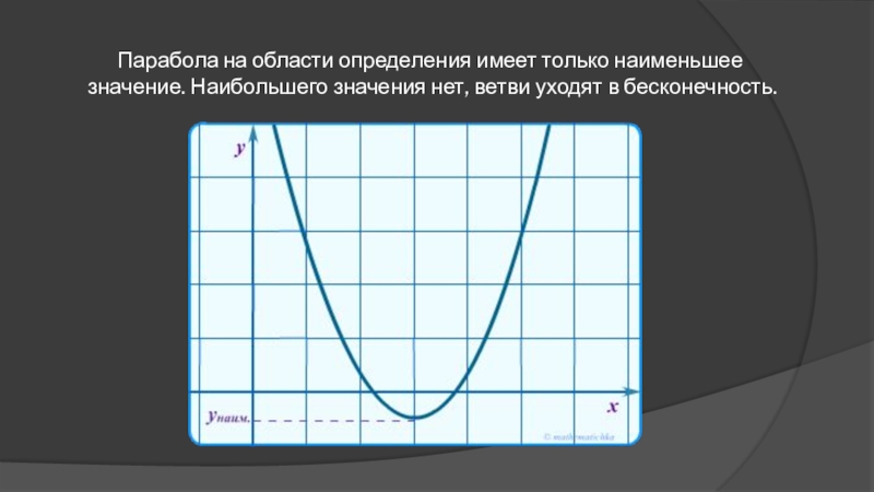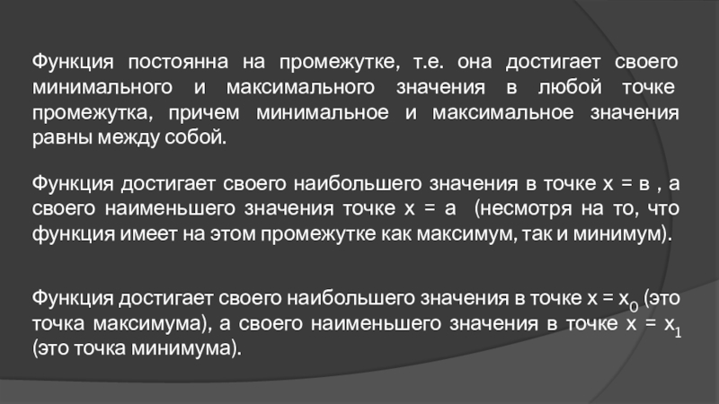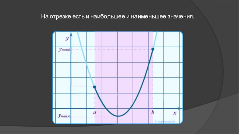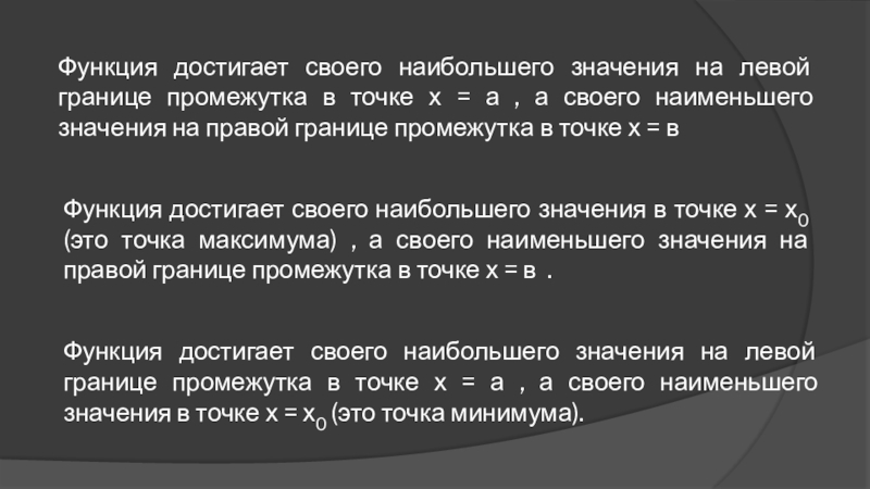 Функция достигает своего наибольшего значения на левой границе промежутка в точке х = а , а своего наименьшего значения в точке х = х0 (это точка минимума).