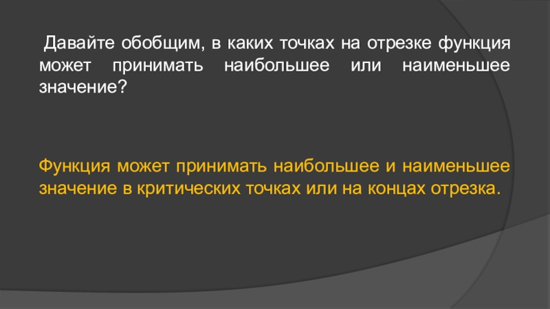 Функция может принимать наибольшее и наименьшее значение в критических точках или на концах отрезка.