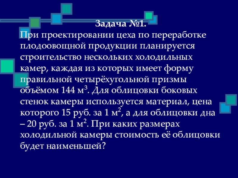 строительство нескольких холодильных камер, каждая из которых имеет форму правильной четырёхугольной призмы объёмом 144 м3. Для облицовки боковых стенок камеры используется материал, цена которого 15 руб. за 1 м2, а для облицовки дна – 20 руб. за 1 м2. При каких размерах холодильной камеры стоимость её облицовки будет наименьшей?