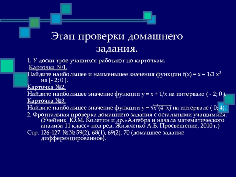 2. Фронтальная проверка домашнего задания с остальными учащимися. (Учебник Ю.М. Колягин и др.«Алгебра и начала математического анализа 11 класс» под ред. Жижченко А.Б. Просвещение, 2010 г.)