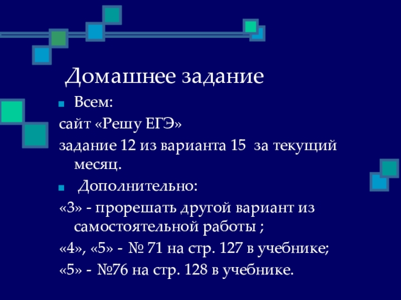Стр. 126-127 №№ 59(2), 68(1), 69(2), 70 (домашнее задание дифференцированное).