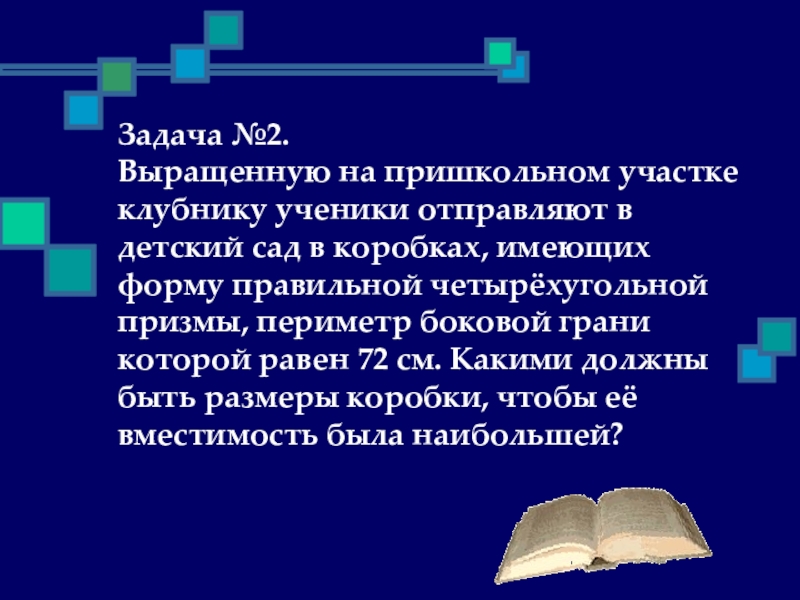 в коробках, имеющих форму правильной четырёхугольной призмы, периметр боковой грани которой равен 72 см. Какими должны быть размеры коробки, чтобы её вместимость была наибольшей?