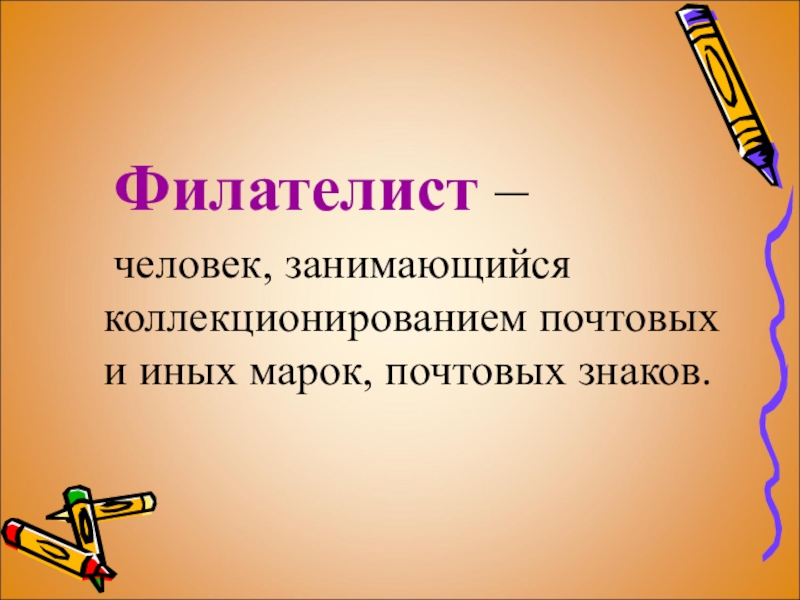 Филателист – 	человек, занимающийся коллекционированием почтовых и иных марок, почтовых знаков.