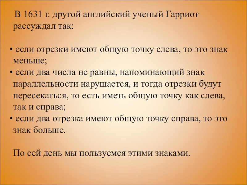 В 1631 г. другой английский ученый Гарриот рассуждал так: если отрезки имеют общую точку слева, то