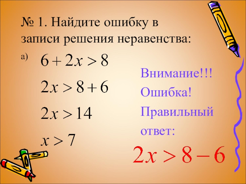 Слайд 7№ 1. Найдите ошибку в записи решения неравенства:
