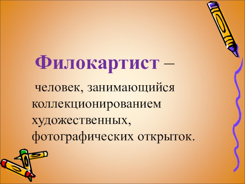 Филокартист – 	человек, занимающийся коллекционированием художественных, фотографических открыток.