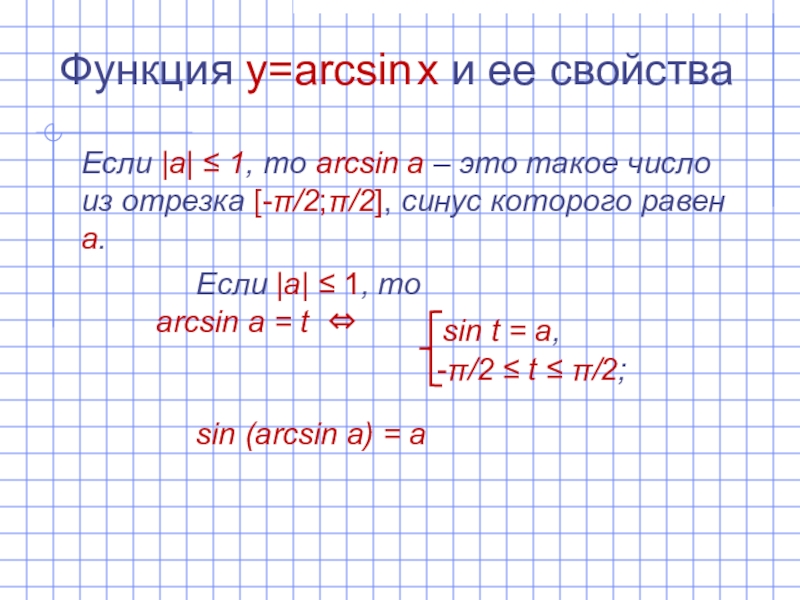 Функция y=arcsin x и ее свойстваЕсли |а| ‌‌≤ 1, то arcsin а – это такое число из