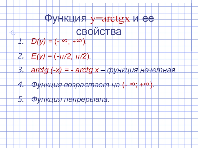 Функция y=arctg x и ее свойстваD(y) = (- ∞; +∞).E(y) = (-π/2; π/2).arctg (-x) = - arctg