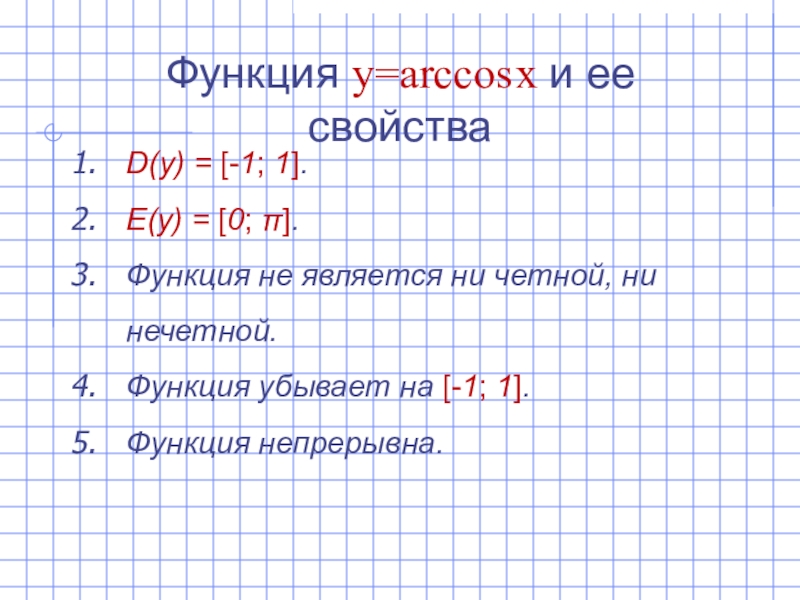 Функция y=arccos x и ее свойстваD(y) = [-1; 1].E(y) = [0; π].Функция не является ни четной, ни